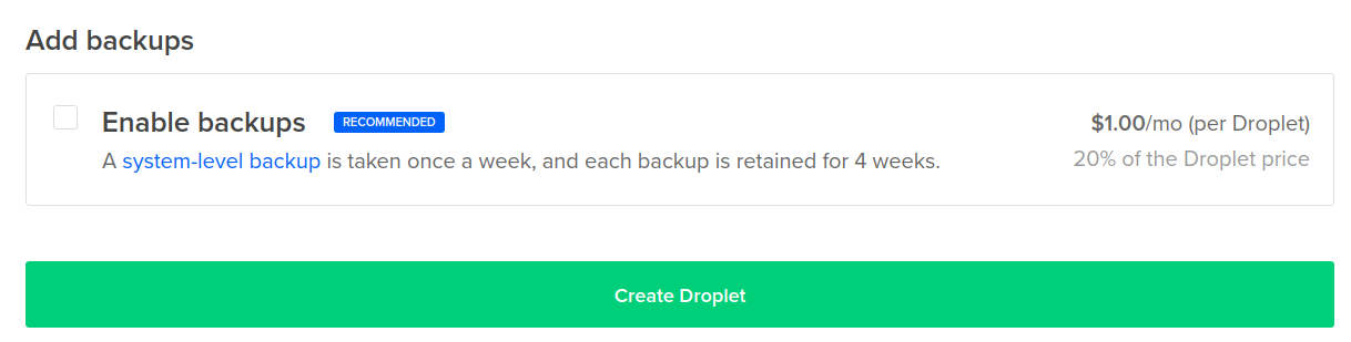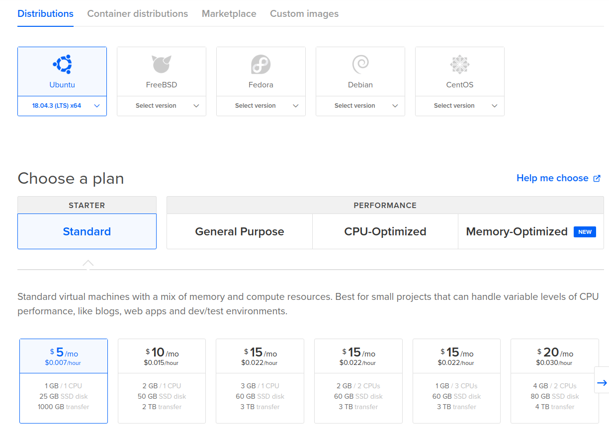 Since this is just personal blog, I wasn't expecting much traffic so a standard 5$/month instance on Digitalocean would do the job. I chose Ubuntu 18.04 for for the OS, but there shouldn't be much difference when choosing another OS since the setup relies on Docker.