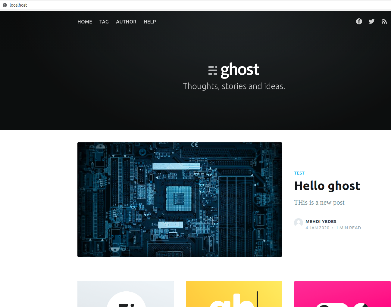 974954b5d518 nginx "nginx -g 'daemon of…" 13 seconds ago Up 10 seconds 0.0.0.0:80->80/tcp, 0.0.0.0:443->443/tcp blog_nginx_1By navigating to your VM's public IP address or to (if you are running ghost on your local environment), you should now be able to access your new ghost blog: