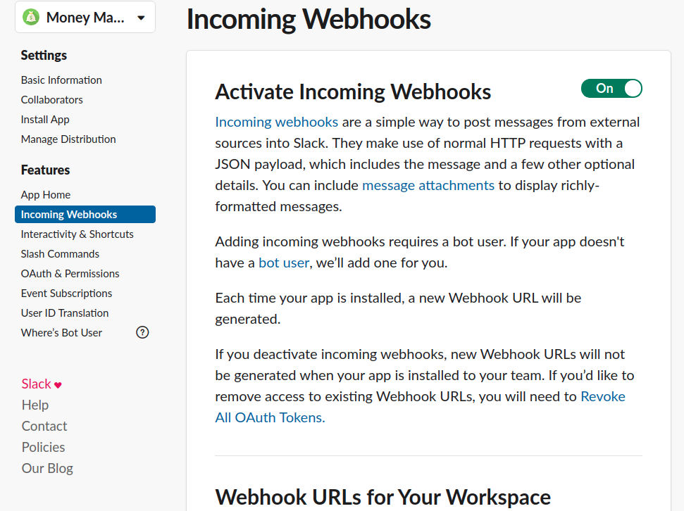 To receive incoming webhooks we need to create an App in the Slack dashboard.