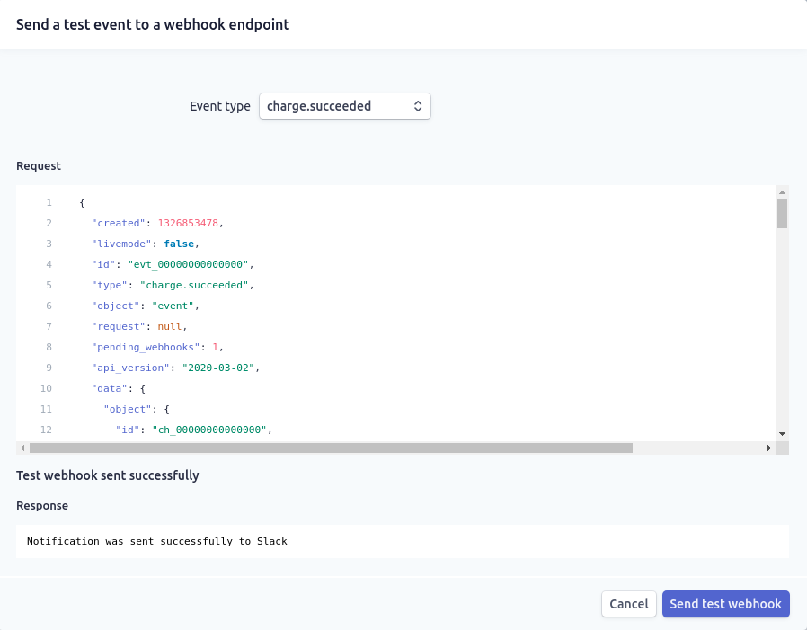 The function only supportscharge.succeededStripe events for now, so any other type of event will receiveUnsupported event typeerror from the function, and no Slack messages will be sent.
