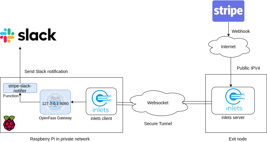 In our setup, every Stripe webhook event that is received by the inlets client will be forwarded to the OpenFaaS gateway on the Raspberry Pi, which will in turn trigger the stripe-slack-notifier function to send a new Slack notification.